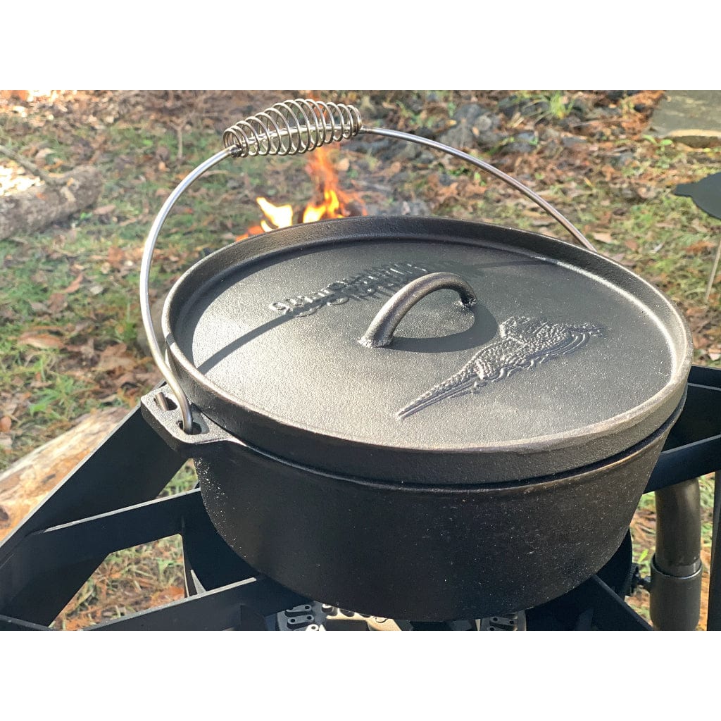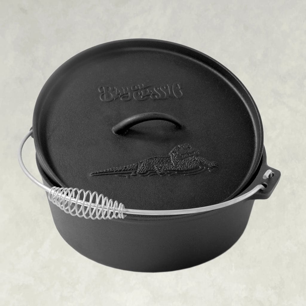 Bring rustic appeal and natural flavor to your kitchen, backyard, or campsite with Bayou Classic® Cast Iron Cookware. Outdoor enthusiasts prefer Bayou Dutch Ovens with a flanged camp lid supporting coals to hold a steady temperature. These heavyweight, seasoned Dutch Ovens are perfect to simmer, stew, brown, braise, roast, and bake. Use in the kitchen, over a campfire, or outdoor cooker to prepare one-pot meals of soup, stew, chili, or beans & rice. Bake cornbread, biscuits, and cobbler. Whatever the occasion, Bayou Classic Cast Iron Cookware adds a warm cozy feel to the modern kitchen or outdoor experience. Bottom of Dutch Ovens are etched with an alligator for a unique bayou detail.